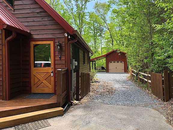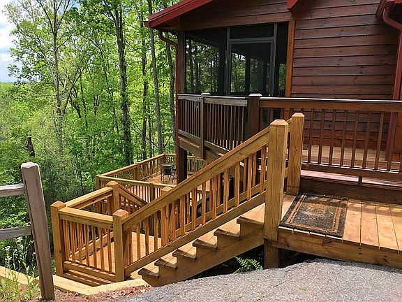 Only ten minutes to downtown Blue Ridge, this is a Great Cabin with mountain views, open floor plan, hardwood floors, vaulted ceilings, metal roof, and plenty of parking area. The main floor has an open living, dining, kitchen floor plan with a gas fireplace and laundry closet. The main floor connects to a screened porch. The kitchen has stainless steel appliances and an eat-at counter. The Master bedroom is on the main floor and has an attached bath with double vanity, & walk-in shower. There is a loft bedroom with balcony and full bath. The finished Basement Game room has a gas fireplace, bedroom, full bath and storage. Off the basement is a porch and an attached deck with wood burning pizza oven and hot tub. This home has a detached garage and shed with additional storage.