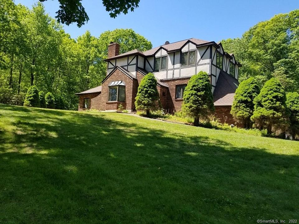 Majestic Tudor on 5.5 beautiful secluded acres with brook and lots of wild life. Spacious open floor plan interior with large rooms. Striking sunken great room with brick fireplace and slider to a large patio overlooking yard. Wonderful four seasons heated sun room. Underneath oversized garage can fit four cars in tandem configuration. A fabulous home on a private lot. 3096 square foot Tudor style Colonial, 7 spacious rooms, 3 bedrooms & 3.5 baths, Four seasons heated sunroom leads to large patio. Electric and rice coal heating. Well water and septic system.