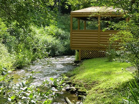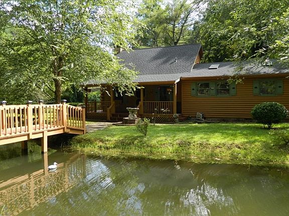 IMMACULATE & CONVENIENT to both Blue Ridge & Ellijay. Nestled between a pond in the front yard and a noisy, rushing creek along the back, this adorable cabin has it all. Fish for Blue Gill and Bass right outside your front door! Newly repainted & remodeled w/high-end granite & SS appliances. Large, bright great room w/exposed cedar beams, skylight & wood-burning FP. Master on main opens to private creekside patio. Relax in your hot tub by the creek in custom 14x18 party deck. Swing on your covered front porch by the pond. Rocked sun-room opens to patio & fire pit along the creek. Spacious, beautifully landscaped grounds to enjoy year round. Even Fido's House is waterfront!