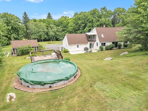 This beautiful country setting features a lovely 4-bedroom, 2-full bathroom Contemporary Post and Beam privately situated on 7.33 acres with stonewalls and a paved driveway. The property includes an oversized 2-car garage with storage cabinets, 2 large outbuildings, a patio, and an above-ground pool with a deck. When you step inside the dining room, with its tiled floor, serves as an inviting entry into the home. The remodeled kitchen boasts cherry cabinets, granite countertops, a tiled backsplash, and a wood-beamed ceiling. The large living room features a cathedral ceiling, a Harmon wood pellet stove and wood flooring. 1st floor main bedroom, plenty of closet space. The 2nd floor has a balcony overlooking the living room, a large loft with a skylight and access to a covered exterior balcony, and 3 nicely sized bedrooms with ample closet space. The finished basement offers garage access, a large family room, an office & playroom. Seller is offering a $5000 closing cost credit.