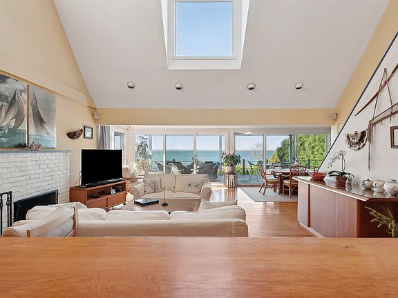 Private sandy beachExpansive windowsOutdoor fire pitCovered deckPristine cape-style homeOpen airy atmosphereCozy seating area