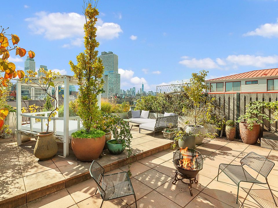 The expansive landscaped rooftop terrace is ideal for alfresco dining, sun lounging, stargazing, and urban gardening, complete with water and electric hookups, lush planters, and stone paversa perfect city oasis.
