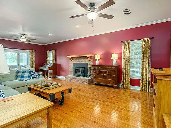 Lakefront brick home built in 1990 Lakefront (300 feet), wooded lot (0.9 acre) Granite countertops in kitchen, primary BR & utility room Wood vanity tops in BR #2 & #3 Custom cabinets and vanities Nail-down Hardwood floors Wood clad double hung windows Wood burning fireplace (Buck Stove) Living room 15’6” x 27’6” Kitchen 11’6” x 12’6” with wooden tongue and groove ceiling Dining area 11’6” x 15’ with wooden tongue and groove ceiling 3 bedrooms with walk-in closets • primary BR first floor 13’6” x 15’6” • BR #2 16’ x 15’ • BR #3 13’6” x 10’6” 3 bathrooms (first floor bathroom with zero entry shower) Laundry room Heated: 1,971 square feet Porches: 756 square feet Total: 2,727 square feet Main level: 1,256 square feet (9’ ceilings w/crown molding) Second story: 715 square feet (8’ ceilings) Detached Carport Workshop Pier Water heater 03/2023 HVAC (Water Furnace) 10/2020 Sewer pump 2017 (annual sewage lagoon fee: $200.00) Asphalt shingle roof about 2010 Appliances included: GE refrigerator (07/2021) GE 30-inch double stove with convection function HOA with covenant and annual fee: $200.00 2022 taxes: $1,797.71