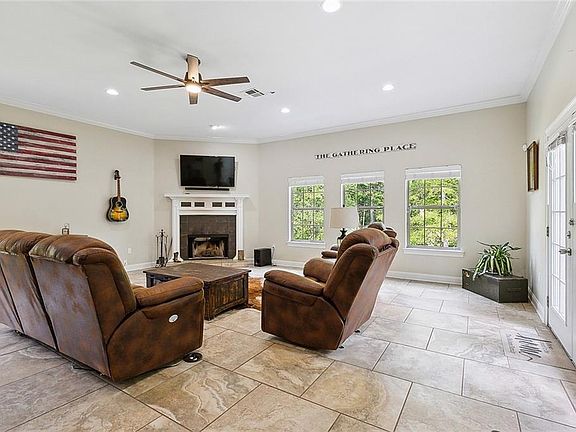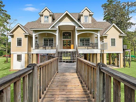 Outdoor paradise on a sandy beach on the Little Tchefuncte River. Offers 3 bedrooms 3.5 baths plus study/office/4th bedroom, soaring ceilings throughout. Large den of kitchen with fireplace, wall of windows with spectacular views. Formal living has custom bookshelves, fireplace and french doors leading to back deck overlooking the river. Exceptional kitchen with custom cabinets, tons of storage, ample counterspace, granite, tiled backsplash, center island with gas cooktop, stainless appliances, double oven, wine cooler and huge walk-in pantry. Cozy primary suite has a fireplace, a sitting area w/a serene view, french doors leading to back deck and 2 walk-in closets. Lavish primary bath has hydro tub, dual sinks and separate shower. 2 bedrooms, each having private full baths upstairs. Open area under house for parking or entertaining. Tons of amenities including a lift to bring up groceries, amazing raised workshop, bamboo flooring and 24" tile, house plumbed for gas and much more! New roof installed in 2020! Vacation all year round on this stunning, private and breathtaking 7.5+/- acre property. A must see!