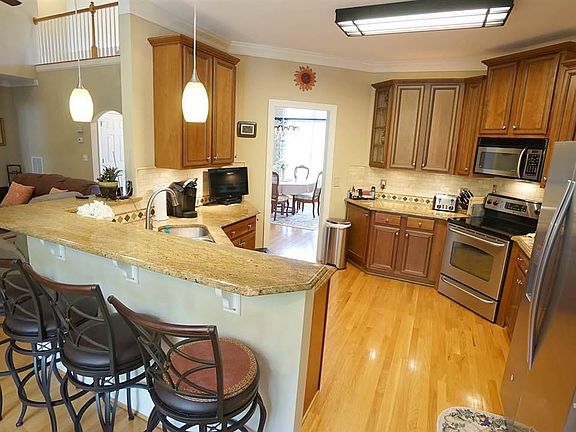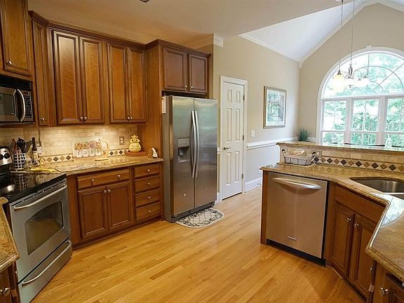 Immaculate custom home on large landscaped lot! Granite countertops, tile backsplash, stainless appliances, wrap-around breakfast bar, crown moulding, tray ceiling, hardwood floors, screened porch, deck, covered front porch. MBR, BR2 & BR3 all have walk-in closets. Detached 2-car garage with stairs to 2nd-story storage makes an ideal workshop. Huge walk-in crawlspace adds tons of additional storage space. Great location tucked away but close to shopping and just a short walk to community pool.