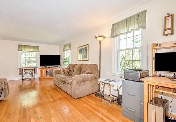 Picturesque Cape set on a country road walking distance to the Lower Village shops & conservation trails. 2 bedrooms, with a small 3rd bedroom/dining room on the first floor. 2 small porches, 2 decks a lovely rear yard. Freshly painted interior. Very pretty with a recently paved driveway and a new roof. Rear plus is the 2 car garage.
