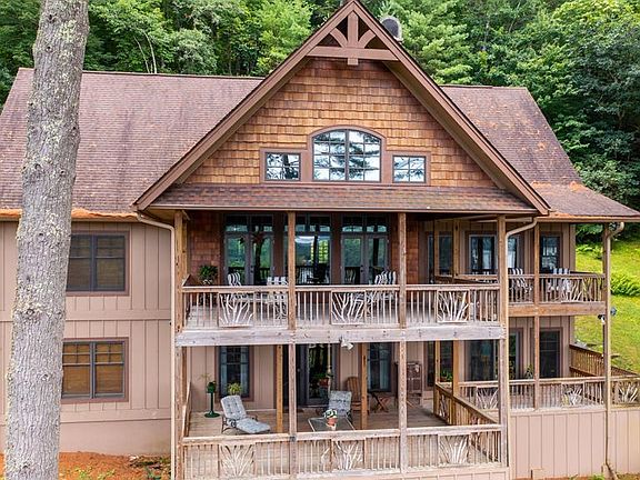 Custom built home with fine touches, quality materials, and an extraordinary view of Lake Glenville. This is the home you've dreamt about. It is inspired by a local high-end builder's design, with his fingerprint evident throughout. High vaulted ceilings, an abundance of light, and open spaces that extend to large porches overlooking the main channel of the lake. This small community has its own private beach and day-use dock. The home features two beautiful stone masonry fireplaces, four bedrooms and baths, beautiful custom cherry cabinetry, and hickory flooring throughout the main floor. Downstairs, you will find an area large enough for a mother-in-law apartment with a pre-plumbed space that could become a small kitchen or just make it a game room as it once was. There is a large lake view porch, a second laundry area, and access to the double garage. A small garden area and mature plantings create an efficient, easy-care yard. The home also features dual water heaters, professionally installed generator, gas grill line, and Dual Fuel stove. Just 10 min to Cashiers Crossroads and paved all the way.