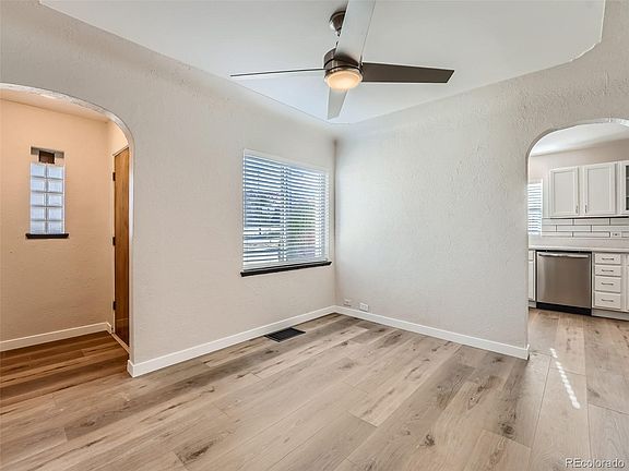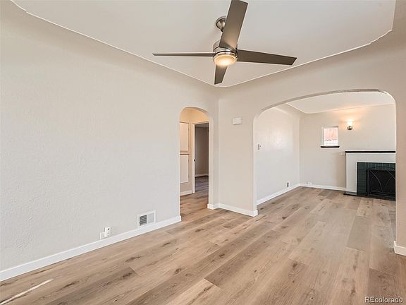 - Description: Vinyl Plank Floor, Neutral Tones, Arched Doorways, Ceiling Fan