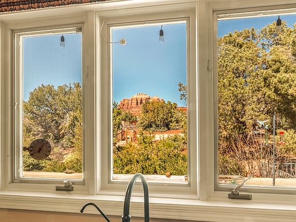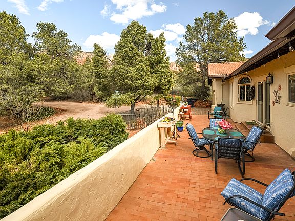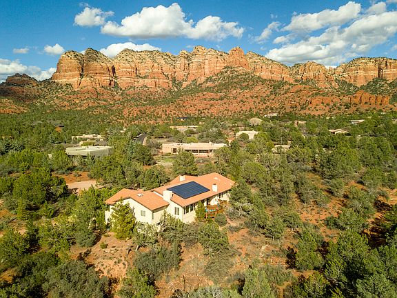 Remarkable home in Highland Estates gated community. Sits on 1.47 acre lot with natural arroyo that boasts an impressive 25ft waterfall during heavy rainfall! Owners say it's a joy to experience! Comfortable family room has a fireplace and sliders to back deck overlooking the arroyo. Kitchen has loads of Corian counter space, built in desk, breakfast bar and a perfect view of Cathedral Rock. Sunken living room also has CR view and there is formal and informal dining areas. Master has kiva fireplace, access to deck for stargazing and outdoor spa for romantic escapes. Dual vanities, granite counters, walk in shower, sep tub, and 2 closets. Oversized guest bedrooms have a Jack-n-Jill bathroom. Also: workshop, studio, workout, office. Meandering paths go thru the tranquil, private yard.