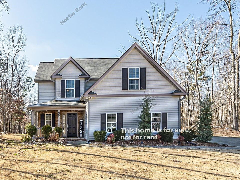 Are you looking for a more secluded homesite with a larger lot?! This 2014 home is situated on a sprawling 1.58 acre lot with lots of trees for more privacy. Beautiful vinyl and stone 2-story home features a covered front porch, brick enlaced patio, 2-car garage with side load access, and gutters. Home boasts over 1,700 sq ft with 3 BRs/2.5 BAs and bonus room. Updated modern paint throughout, NEW carpet, and laminate floors. Open kitchen features and island, granite countertops, pantry, and stainless steel appliance – including smooth top range, dishwasher, and microwave. Airy living room has a fireplace situated perfectly in the corner. Expansive owner’s suite with trey ceiling, walk in closet, and bathroom with walk-in shower. Close to I-85, Bypass 1, Wake Forest, Youngsville, Durham, & more! LOW HOA fees of $132 per year!