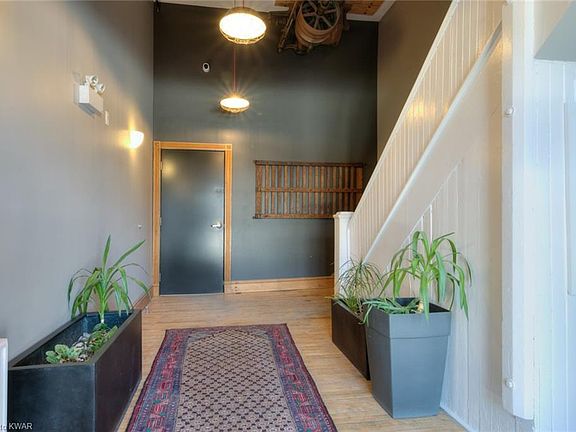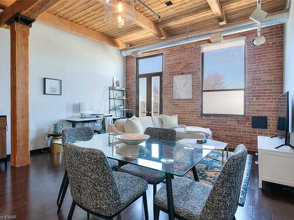 Charming original brick and beam unique one of a kind condo loft design. This open concept layout, soaring ceilings and extra large windows offer a bright and airy feeling throughout the suite. Large custom kitchen features stainless steel countertops with excellent storage. Recessed lighting has been replaced throughout the unit to include energy efficient and dimmable smart lights. Lovely west facing balcony to soak in the evening light. Unit includes 1 parking space and locker. Quiet residential neighbourhood within walking distance to beautiful historic downtown Galt. Enjoy walks at the Grand River, visit the Cambridge Farmers' Market, Idea Exchange, Cambridge Mill, local shops, and restaurants. Don't miss this awesome and rare opportunity!
