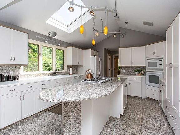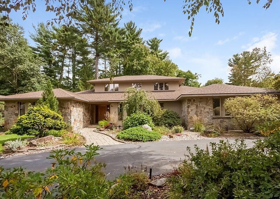 Custom, steel beam constructed, well maintained contemporary home w/spacious open plan brimming w/natural light & gleaming hardwoods on private, lushly landscaped lot w/covered pergola, wood decks, gardens & pond feature. Fabulous first floor highlights open plan w/circular flow, welcoming foyer offering sight lines to all living spaces including dining & living room. Convenient first floor master suite includes walk in closet, hardwoods & renovated bath w/radiant floor heat, his & her maple vanities w/granite tops, large soaking tub w/waterfall faucet & walk in, tumbled marble shower w/glass frameless doors. Expansive kitchen features center island w/seating for 4 & gas cooktop, plenty of prep space on granite & solid surface tops, loads of cabinetry including pantry & eating area overlooking large family room w/vaulted ceiling & stone fireplace. Mudroom area off the 3 car garage features laundry room, double closet & powder room. 2nd floor features two more bedrooms & full bath.