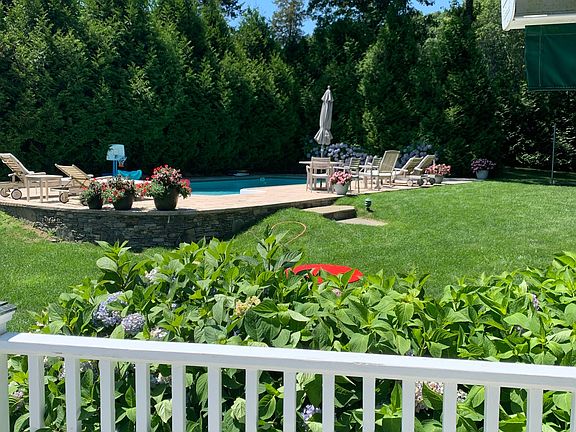 On the fringe to the Village, Beaches, Round Swamp Farm and Marinas. This 1954 renovated Ranch was expanded and upgraded in 2009 with a lot more room for expansion. The one acre that this charming cottage sits on is lined with mature evergreens, has; a solar Heated Pool, stacked stone walls, large front yard w/vegetable garden and an equally sized back yard where the tree house hangs. The freshly painted main level offers; the addition of a family room and foyer, a new master bathroom with tumbled marble and built-in closets throughout. The kitchen advanced with an office space, wood cabinetry and new appliances. The full dry basement is semi finished with a separate laundry room, several storage rooms and is 4th bedroom ready. Mechanics installed in 2009: a whole house dehumidification, central air system, security, and central vacuum all maintained and energy efficient. The infrastructure of the property equipped with dry wells, new underground electric, new septic system and a motorized awning for the rear deck. Cool little house but not so little.