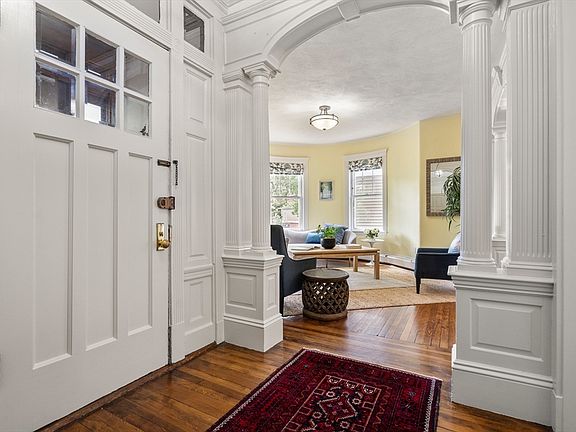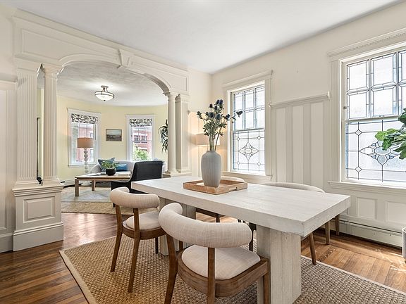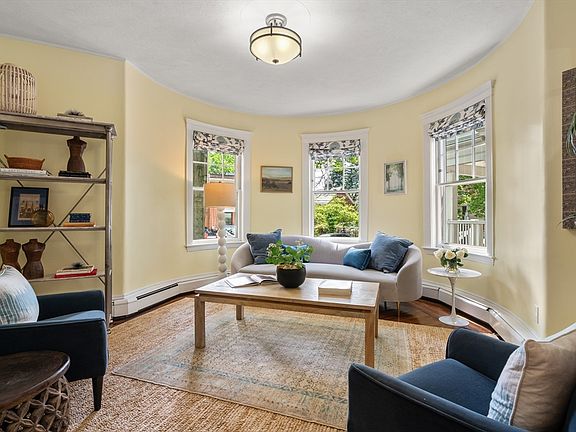 Beautifully renovated with sophisticated period details throughout, this first-floor home provides a well-designed floor plan with high ceilings and tall windows. Through the foyer, you are greeted by a spacious living room with gorgeous bow-fronted windows, and a seamless flow to the dining room. The kitchen showcases stainless steel Bosch and Thermador appliances, stone countertops, custom cabinetry, a peninsula, and a tile backsplash. Off the kitchen is the family room with a fireplace, pocket doors, bay window, and custom built-ins. Located at the back of the house, the tranquil primary bedroom provides a double closet, adjacent bathroom, and door to the private covered porch. There are two additional bedrooms and a hall bathroom with laundry as well. Outside, there is assigned parking and lovingly maintained gardens. Sited in a most convenient location between Harvard and Inman Squares, accessing restaurants, shops, schools, parks, and swimming pools is easy.