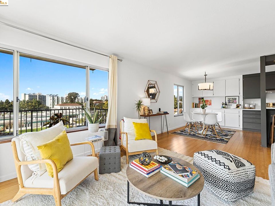 Light-filled and spacious, this corner unit Adams Point condo has been tastefully updated and awaits its new owners. Spend your evenings out on the expansive private balcony facing the sunset savoring the fantastic views of the city. The two bedroom two bathroom 1094 sqft unit is situated on the first floor at the back of the building with just one shared wall. With a bounty of natural light, updated kitchen and baths, and a seamless living/dining area that opens to the outdoor space, this home provides the perfect blend of comfort and style. The unit boasts new quartz countertops, new bathroom flooring and counters, new bedroom carpet, and a fresh coat of paint. The spacious primary bedroom is accompanied by an ensuite bathroom, while the second bedroom opens out to the balcony. Each floor has shared laundry and every unit has one parking spot in the enclosed garage. Enjoy all the benefits of living in the heart of Oakland, just minutes away from Lake Merritt, Whole Foods, BART and the abundance of local restaurants. Come take a look today!