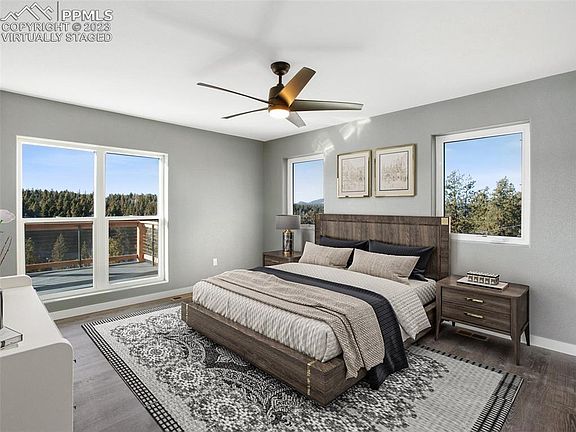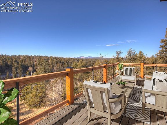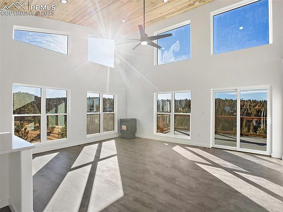 Newer Construction. This custom gem was completed approximately 1 year ago and was designed for this lot to maximize views of the mountain ranges to the south and west. The custom features are endless. Starting with the outside, this mountain chalet has a class 4 metal roof that is resilient to the elements along with custom prefinished LP Smartside siding. The large deck, featuring Trex composite decking, provides a great place to relax with fabulous views!. Inside the entire house is clad in high quality LVP flooring. The kitchen features premium stainless appliances, quartz countertops, 42” tall upper cabinets and is finished off with the custom backslash. The ceilings are nearly 16 foot tall at the back wall, providing an amazing southern view and are covered in custom tongue and groove blue stain pine to provide a modern mountain feel. The windows are equipped with custom motorized SmartWings blinds. The living room has a pellet stove that is rated to heat the entire house on a cold winter night in the mountains. The finished loft over the master bedroom can be accessed with a sleek fold down access stairs and includes custom railings for safety. The master bath ensuite is an oasis of its own with a soaker tub that provides a view of the outdoors and a custom tile shower surround, walk in closet and a laundry room with a high end washer and dryer. The lower level includes two more bedrooms and a full bathroom. The house is also equipped with a radon mitigation system. Located on a cul de sac, this location provides a quiet low traffic setting. This home is truly a work of art! There's even an area designed to park an RV. Located just minutes from the town of Florissant, Divide, Cripple Creek and only 30 minutes from Woodland Park make this a great location. Gold metal fishing, boating, amazing hiking and ATV trails are all less than 1 hour away. Skiing is less than 2 hours away!