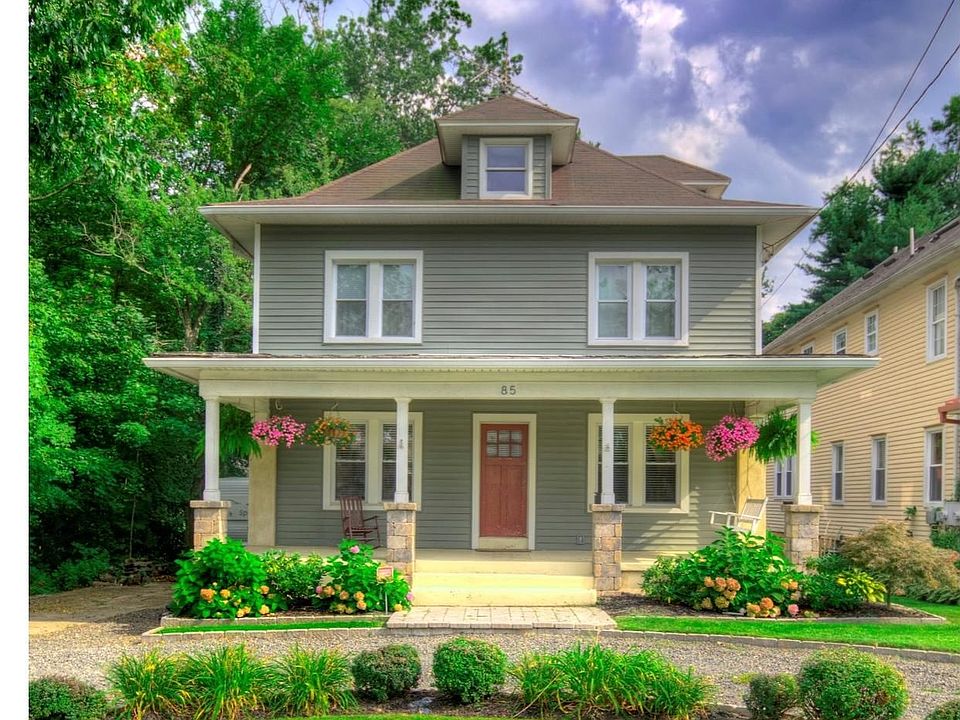 This traditional four bedroom two full bath home has been lovingly refurbished throughout for the most discerning buyer. The location, convenient to New Jersey, New York and Philadelphia make it a commuters dream. The circular driveway and inviting, super deep, stone pillared front porch welcome you to sit on the porch swing or rock on your rocking chairs on lazy afternoons. Inside, you are greeted with gleaming wood floors in the bright and airy living room complete with newer triple windows and upgraded wood moldings. To the right is another sunny room, which could be used as a family room, office or formal dining room currently set up as a playroom. Through the french doors, the renovated gourmet kitchen will please the chef of the household, with custom cabinetry, stainless steel appliances, and granite countertops, as well as an upgraded lighting package, tile backsplash and custom wainscoting. A separate eating area also leads you to the enchanting back yard, complete with a custom built, covered two-tier deck with built in furniture and an oversized, fenced in private, park like back yard, complete with a custom designed splash pool, complete with slides and fountains great for people of all ages! a playground area, and still plenty of open space to play. The first floor full bath is also completely upgraded. Upstairs, every room has been updated with the owners designer touches. The generous master bedroom with knotty pine ceiling has plenty of closet space. Three additional oversized bedrooms also with plenty of closet space, and a totally renovated and upgraded hall bathroom with granite tops, tile floors and custom tile tub/shower is conveniently located at the top of the steps. A two car detached garage is an added bonus. This lovely home is move in ready and will not last!