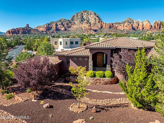 Be enchanted by this exceptional W. Sedona residence which exudes quintessential SW Style & features gorgeous panoramic views. Featuring a fabulous W. Sedona location-this beautifully maintained home highlights 3 BR, 2.5 BA + an attached Casita (approx. 300 sq. ft.) w/ ¾ bath (an exterior entrance) for a total of 4BR, 3.5 BA, 2581 Sq Ft, plus oversized garage (approx. 775 Sq ft). The gracious entry opens to the great rm boasting - high ceilings, stacked stone FP & large picture windows facing the fabulous views, enchanting SW design details like bancos, vigas, lighted art niche, entertainment (TV) nook, arched hallway & access to the large deck to enjoy the incredible views & the creatively crafted railing. See supplement for the many features if this home! The SW influences continue in the large kitchen which includes a large w/i pantry, cabinets w/ pull-outs, Jenn-Air range, built-in wall oven w/ microwave & breakfast bar. Spacious primary suite w/views & bath w/ artful touches, dual vanities, large w/I shower & closet. The 4th BR (Casita) (approx. 300 sq. ft.)is accessed via a separate exterior entry & offers high ceilings, murphy bed, large bath w/ shower & views. The 2 guest rooms feature high ceilings, views & ceiling fans. The north facing guest rm/office includes access to the large deck & great vistas. The shared full guest bath is beautifully tiled. Other features include split floorplan, large laundry room, whole house humidifier, R/O system, security system, alder cabinetry & large storage area located under the home.