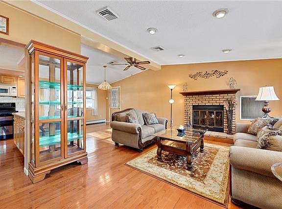 Dover,3 bedrooms (lives like 5) 2 full bath, 2600 sqft impeccable Ranch on 1 acre of sprawling property located on a cul-de-sac.Closeto schools, shops, and train. This impressive home offers a cooks kitchen with center island & lots of storage. The lovely dining areaoffers hard wood floors & flows into the living rm with majestic brick fire place & beautiful bay window.The master bed rm isspacious with walk in closet & full en suite bath. 2 additional bed rms & full hall bath complete the main level. The huge family rm ismade for fun or just relaxing with bar, pellet stove & plenty of room for guests. 2 large rms off family family rm are great for officeor den. Basement also offers walk out to back yard through Bilco doors. The heated 2 car attached garage has plenty of space for awork area, generator hook up & is walk out to back yard. The park like property must be seen to be believed, offering breathtakingsunset views & plenty of space to entertain.