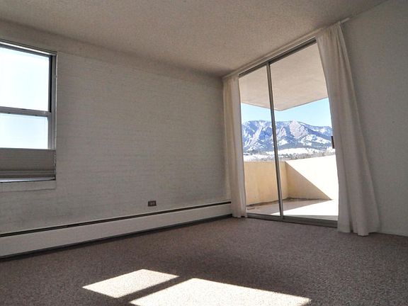 Enjoy a breathtaking view of the Flatirons from this 6th floor condo located across the street from Campus, bike paths, and major bus routes. The building has a secure entry system, outdoor pool, rooftop deck, laundry room, and includes one reserved parking spot. Recently remodeled with new carpet, appliances, and countertops. Owner plays for heat and water, tenant pays for electricity. Unfurnished. No pets. No smoking. No smoking. No pets. Owner pays for heat, trash, and water. Tenant pays for electricity and cable.