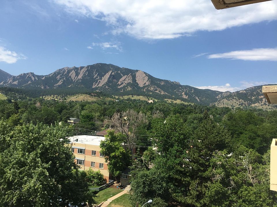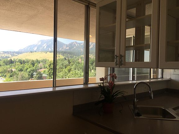 GREAT MOUNTAIN VIEWS from 7th floor penthouse from living room, dining room, kitchen, deck and bedrooms. Recently remodeled 2 br/ 2bath. Security building. Open floor plan. West of Broadway across from CU. Walk/bike to campus, trails, downtown, Basemar, Chautaqua. Covered parking. Storage in basement. Swimming pool. Ideal for CU faculty/staff/graduate students. Seeking responsible professionals. Renter responsible for electricity/heat.