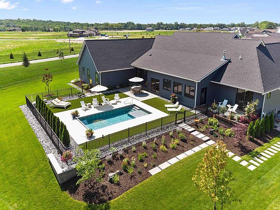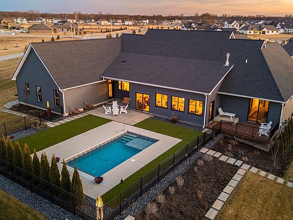 Luxury resort style living in this expansive open-concept 5 bedroom, 4.5 bath MOVE IN READY ranch in Cascata Estates (NWAC Schools). Less than 5 miles from Parkview Regional Hospital and steps away from the Pufferbelly Trail. This better than new home includes a finished basement with abundant natural light and built in shelving. The strategically designed floor plan boasts a primary wing with bath en suite, custom white oak cabinetry, oversized soaking tub, large custom designed walk-in closet, laundry and upper-level loft retreat. An entertainers kitchen features BOSCH pro appliance package with two dishwashers, wine and beverage refrigerators, a walk-in pantry, custom white oak cabinetry with an 8’ island. Cambria quartz countertops come with a lifetime warranty. Watch the sunrise and wildlife from the gorgeous sunroom which leads to your outdoor oasis featuring a 12x24 plunge in-ground pool with sun shelf, automatic chlorinator, automatic cover, and extra wide polished concrete deck. The pool area is surrounded by SYNLawn® Artificial Grass, hardscape patio, beautiful perineal gardens, and aluminum fencing with puppy guard. Other notable features include a Carrier Infinity high efficiency furnace, water softener, programmable thermostat, security system and custom window treatments. The professionally landscaped, fully irrigated yard includes 35 trees planted on this near half acre lot for added privacy and visual advantage from inside the home. Kentucky bluegrass sod, extensive hardscape, curbless entry drive, oversized 3-car garage with epoxy flooring and custom cabinetry are also included. Whether you are a large or growing family or empty nesters, this beautiful home has all the details covered. A must see!