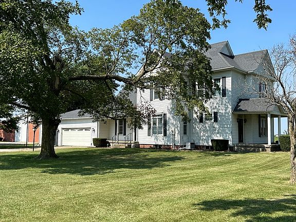 This 4 Bedroom original Farmhouse is situated on 10 acres, 7 which are tillable. Machine shed 43x80(room1:17x40concrete floor, room2:41x61 gravel). Beautiful Hand carved Original Woodwork. Master is located on main level which includes master bath and office area. Eat-in Kitchen, separate Dining Room with gas fireplace & built-ins. Laundry room was an addition. Upstairs you will find the additional 3 bedrooms, bonus room & 1/2 bath. Basement has outside entrance. 200 Amp electrical. Attached Garage has generator & Gas Heater. Hardwood under carpet(except Kitchen & Bathrooms). Hot water heat '21. Private Well but City water is available. Septic tank '08. Roof '08. Anderson Windows replaced '08. High Velocity Central Air . Central Vac. Pool table & Appliances stay. Owner willing to rent acreage & plant. All Crop revenue from 2023 will go to current owner.