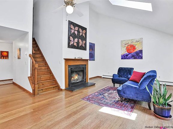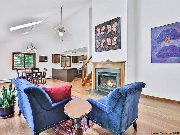 This Hudson Valley contemporary sits on .45 acres, surrounded by mature trees, a sprawling front deck, and gardens for homegrown food. Just 1:45 hrs from NYC, Rosendale has been dubbed one of the hippest towns in the Hudson Valley, offering the charm of Upstate with the convenience of downtown. With all that this area has to offer, this three-bedroom home is loaded with curb appeal and complemented by modern updates. You will be swept off your feet when you enter the thoughtfully designed floor plan, with sun-drenched living spaces, clean lines, and simple finishes. The desirable open concept living room features sustainable bamboo floors, soaring ceilings, large open windows, a beautiful centerpiece wood-burning fireplace, and French doors leading to the west-facing front deck overlooking the front yard. The living room flows into the bright sunny open concept dining area and beautiful updated kitchen with new cabinets, countertops, and all new appliances; plenty of space to cook and enjoy friends and family. The main floor also features a ground-floor bedroom, full bathroom with tub/shower combo and private laundry room. The second story features two oversized bedrooms with a second full bathroom. The finished basement offers ample space ideal for a family room/game room, home-office or guest quarters, with additional space for storage. The rear yard is the perfect place to enjoy days and evenings through all four seasons. The property also features a spacious attached one-car garage. Minutes to the best eateries, shopping, hiking, world class climbing, and all the Hudson Valley has to offer at your fingertips.