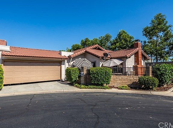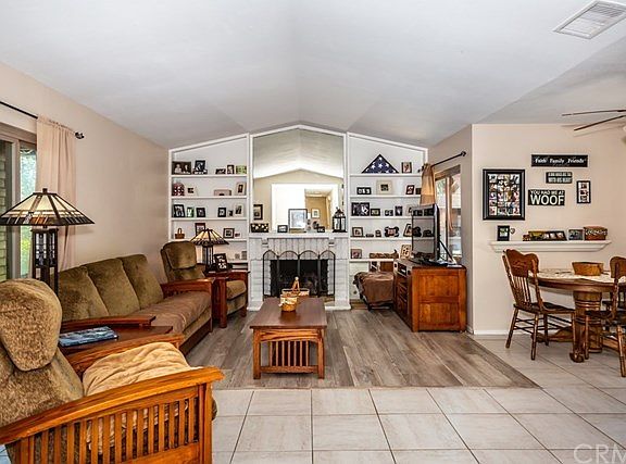 This single story 3 bedroom, 1 3/4 bath home is move-in ready for its new owner! The home features low maintenance ceramic tile and wood laminate flooring, ceiling fans in 4 areas of the home, central air, a mirrored wet bar, and built-in shelving on both sides of the wood-burning fireplace in the living room. The newly painted, spacious kitchen has lots of counter tops, a decorative glass cabinet, a large, LG refrigerator that stays with the property, and a window over the kitchen sink that overlooks a back patio. There is a sliding door off the eating area which leads to that patio that wraps around 2 sides of the house. A second private patio, accessible through the sliding door in the primary bedroom, has a newer aluminum cover, along with artificial turf and an access gate to the common areas. The large primary bedroom has a walk-in closet and separate vanity/shower areas in the bathroom. Additional desirable features include the 2-car attached garage, mirrored closet doors in one of the bedrooms, wood blinds in two of the bedrooms, and dual-paned windows. The home is well-placed in the complex with adjacent guest parking, a community pool and spa, and landscaping that is nicely maintained by the association. This unique property is conveniently located near a wide variety of shopping and services and is a must-see!