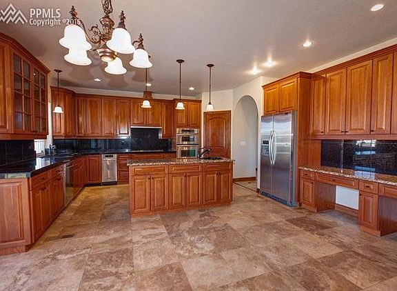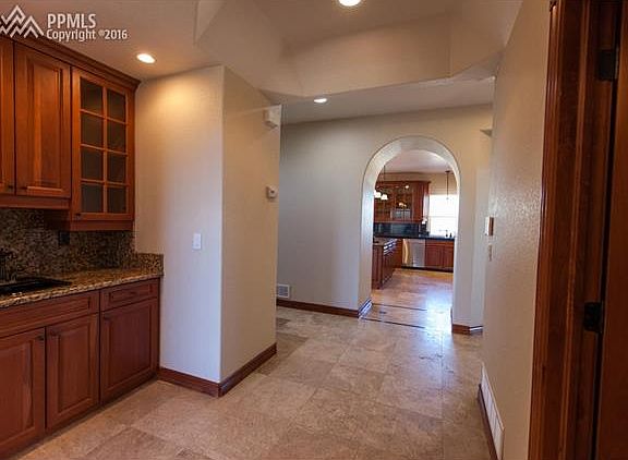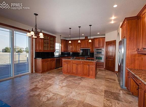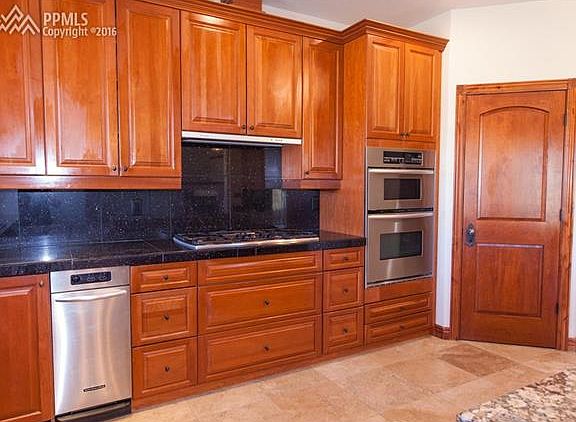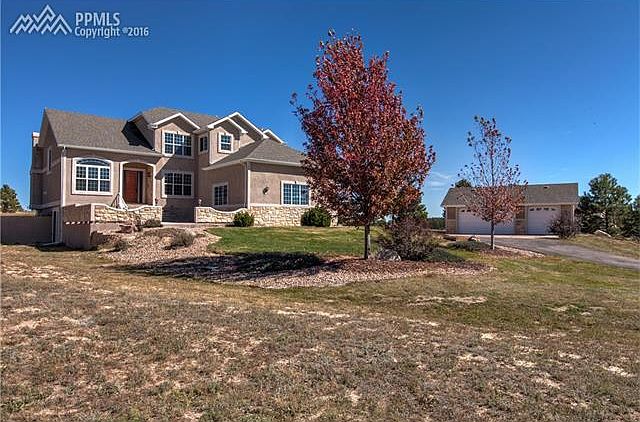Wow! Exquisite stone & stucco home with room for all with 6425 sq. ft. on 2.53 acres plus a detached 3 car garage. Pikes Peak view! Two master bedrooms ( one on the main & one on the upper floor) both with double doors, attached baths, & walk-in closets. Extensive use of travertine, cherry wood, crown molding, & granite throughout. Gourmet kitchen with center island & vegetable sink as well a huge planning area. Upper floor consists of 2nd master plus 3 additional bedrooms & 3 baths. Main floor consists of formal dining room, living room/study, great room off kitchen, butler's pantry, laundry room w/sink & cabinetry, and main floor master suite. Lower level has a huge wet bar off 2nd family room with cozy gas fireplace, theater/exercise room, oversized bedroom or office with walk-out to patio, full bath with steam shower, and bedroom with private, full bath. Outdoor spaces include a 37 x 14 low maintenance composite decking with view railing, 20 x 19 concrete courtyard at entrance, and 14x11 concrete patio on lower level walk-out. Walking distance to elementary school & located on a quiet cul-de-sac.