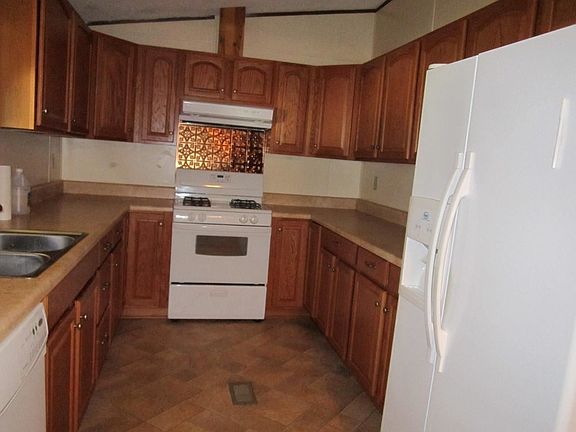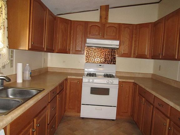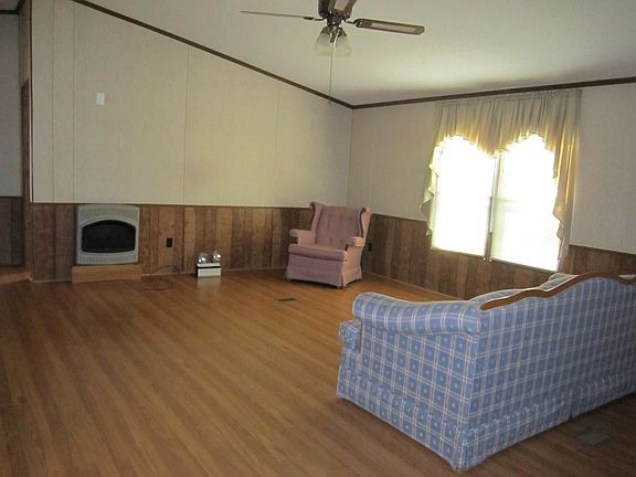 Nice clean 1990 doublewide, approximately 1404 square feet, brick underpinning, spacious Living room opens into Dining area. After mobile home purchased, new kitchen cabinets installed with pull out drawers. All appliances to convey (2 refrigerators and 1 freezer), washer and dryer. Easy to care for laminate floors in Living room, Dining room, and Kitchen. Carpet in all 3 Bedrooms. Seller added single attached Garage, Sunroom, and 3 Bay Detached Garage. There is also a storm shelter behind the detached building. Living room accessory wall heater in working order. The wall heater in the Sunroom does not work. Handicap ramp into Sunroom. Lockbox on Back door. Alarm will be On. Hot water heater is inside exterior smaller door near back door. A garage opener for detached building is on kitchen counter. PLEASE RETURN TO SAME SPOT!! Seller has garage opener for single attached garage door but a garage button mounted on wall of interior of garage which is accessible within the home.