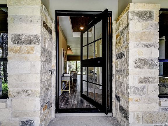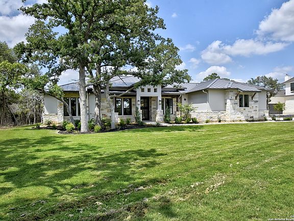 Exquisite craftsmanship in this Journey Homes one story contemporary in the desirable Belle Oaks Ranch. Over an acre tree studded lot offering a beautiful 4 bedroom, 3.5 bath, 3 car garage and 3076 square feet. The drama begins with a 10'x4' steel/glass door setting the stage for the custom details that await a discerning home owner. Bright and airy space is illuminated by thoughtfully placed windows, custom modern lighting throughout and high ceilings making the open concept living even more spacious. A double door entry to the private study greets you upon entering the foyer. Entertainers dream in the open living, kitchen, and dining space with visuals of your guests from every angle. The floor to ceiling stone fireplace creates the ambience in the living area which opens to a view of the kitchen and dining space. The chef's kitchen boasts Italian imported Bertazzoni appliance package, huge island workspace, breakfast bar, gas cooking, SS refrigerator w/double freezer drawers, walk in pantry, soft close custom cabinetry, and deep sink. The dining area allows for a large seating area, contemporary chandelier, optional banquet of cabinetry, and back yard views. The split primary retreat offers bay windows with a view of the majestic trees and a spa bath with huge walk in shower and soaker garden tub. The piece de resistance is the luxurious custom California Closet in the primary retreat. A second ensuite guest room w/high end bath finishes, 2 additional guest rooms w/shared full bath and a private half bath for visiting guests completes the floor plan. Well....almost. This one story smart layout offers a large game room with tongue in groove wood accented raised tray ceiling treatment and wall to wall windows to views of the back yard. Create your oasis in the over one acre level tree dotted back yard and lovely green space with the perfect pool setting. Comal ISD, and community amenities complete the package of the meticulous detail of this gorgeous home.