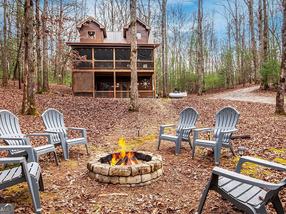 This 3BR/3BA 1,680 sq. ft. cabin is a hikers paradise as it is set in a wooded landscape located just steps away from USFS land that connects you to the Toccoa River. The main level welcomes you into the kitchen, and the open concept layout flows to a naturally lit dining area, and then into the living room, where a gas-log fireplace provides a warm gathering place for family and friends. A full bath and laundry closet nearby add to your everyday convenience. The upper level features two cozy bedrooms connected by a full-sized bathroom, and the stair landing overlooks the great room. On the finished terrace level, the third bedroom and full bath are joined by additional living space / game area, with direct access to the covered patio, where a soothing hot tub overlooks the front yard and fire pit - a perfect combo for enjoying the serenity of the North Georgia Mountains! The community offers access to three small but picturesque lakes, and the USFS land surrounding it has extensive Toccoa River Frontage and a walking trail leading to it. The cabin is located just 1.5 miles from Van Zandt's Grill & Grocery for those quick supply runs, and 1.4 miles from the Toccoa River Sandy Bottoms Recreation Area for more outdoor fun. Whether you are looking for your new home or an exciting new investment (the property is currently on an active rental program), reach out today and schedule a visit to 850 Mountain Lake Circle!