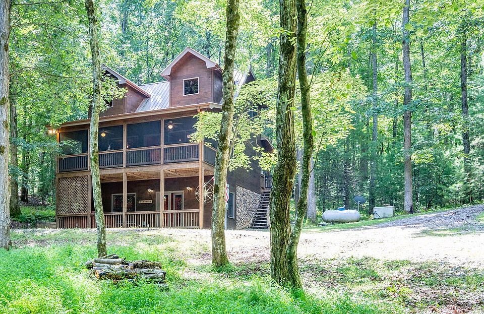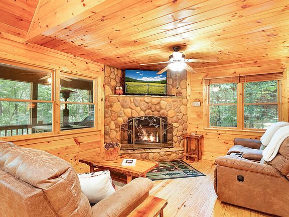 ~National Forest Frontage~ Adjacent to the Aska Adventure Area, this Toccoa River access cabin has a cozy all wood interior with 3 completed levels. Open layout with two upper level guest rooms and full terrace level used as a master suite with den. Large screened porch, additional covered deck, and concrete patio with hot tub offer beautiful wooded views full of wildlife and natural landscaping. Toccoa River, Lake Blue Ridge, hiking trails, and recreation areas just moments away. Gated community with Toccoa River access and stocked ponds throughout the community. Most furnishings will remain. Vacation Rentals permitted.