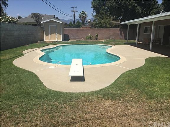 S * P * L * A * S * H * Gorgeous POOL HOME located on a prime, tree-lined, cul-de-sac street of Rialto! Terrific curb appeal, covered porch entry, living rm w/fireplace and formal dining area, gourmet "Country" kitchen with custom cabinetry and counters, upgraded appliances, pantry, and custom tile work. All three bedrooms offer ample living/closet space. Covered backyard patio area terrific for entertaining, huge backyard w/blocked walls for privacy, LARGE GRASSY areas, POOL w/ diving board, two storage sheds, side yard fenced pet area. Two-car garage attached with direct access. New hardwood flooring thru-out, new interior paint, central air, extra storage space in garage. No need to preview . . .This home is immaculate!