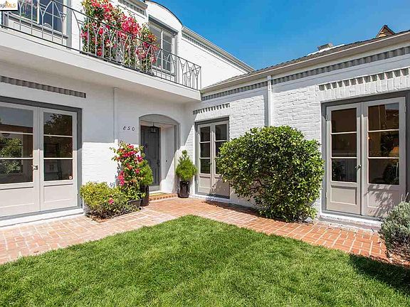 Tucked in Crocker Highlands, Paramount Road comprises one select block of esteemed architecture. Number 850 is well placed along the arc of Paramount's bulbous turning circle, and its property, backed by a green belt, gains leafy privacy. Abounding with indoor-outdoor connections, the home opens seamlessly to a garden courtyard, back deck plus level lawn, and roof deck. French Eclectic architectural influences strike a balance between formality and enchantment. The chic facade entices with arched dormers, an ornamental balcony and arch-inset front entry. In the foreground, a courtyard, partially encased by the home, creates a secret-garden front entrance. French doors from living and family rooms to the brick-laced enclosure make it more than an alluring first impression.From a gracious and grand foyer, public rooms emanate. In the living room, a wood-plank-and-beam cathedral ceiling adds high drama. Built-in library shelves grace the family room, which opens outdoors front and back and the formal dining room offers evergreen outlooks and access via French doors to a newly constructed deck. The dine-in kitchen shimmers with new surfaces corresponding to the home's character. A Bay-windowed banquette offers a seat with a verdant view. Powder room and laundry room are placed nearby.Bedrooms, time-honored yet sparkling, are distinguished by sloped ceilings, hardwood floors, and casement windows. They offer views of treed neighborhood vistas, while the master suite, endowed with three closets, opens to a private deck. Baths, freshly updated and stylistically unified, blend large-scale hexagonal floor tile and marble.Multipurpose bonus spaces with backyard access include a lower-level room ideal as craft studio or office plus the garage at the base of the private driveway, with one side dedicated to deck-adjacent sliding glass doors, which doubles as a garden room suited for entertaining or exercise.