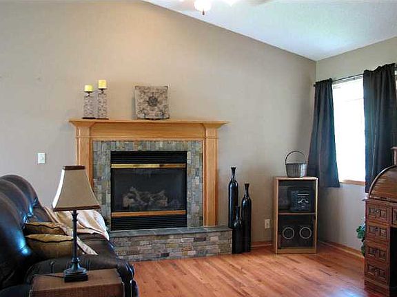LOVELY UPDATED 3-BEDROOM, 3-BATH RANCH!!! Desirable open floor plan with vaulted ceilings in the living room, kitchen, dining area, and master bedroom. Fully-applianced kitchen features an island, eat bar, roll-out shelves, and bay windows in the dining area. Private master bath boasts a corner jetted tub and separate shower. Separate main floor laundry room. Additional interior amenities include hardwood flooring in the living room and hallway, a ceramic tiled entryway, a brick-framed fireplace with gas starter, a security system, plant ledges, ceiling fans, bulldozed corners on the upper level, and an owned water softener. Popular berber-style carpeting spans the spacious family room and generous downstairs bedroom in the home's walk-out/view-out basement. Spectacular view of the area greenbelt from the upper level, upgraded wood deck, or covered lower patio. Meticulously landscaped cul-de-sac lot, with a sprinkler system to simplify lawn care. The exterior also enjoys an upgraded, covered wrap-around front porch, tastefully embellished retaining walls, and a new roof in 2012. A generous 2-car attached garage includes a garage door opener and 2 remote controls.