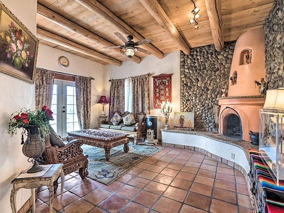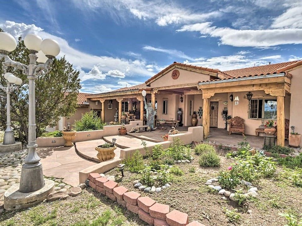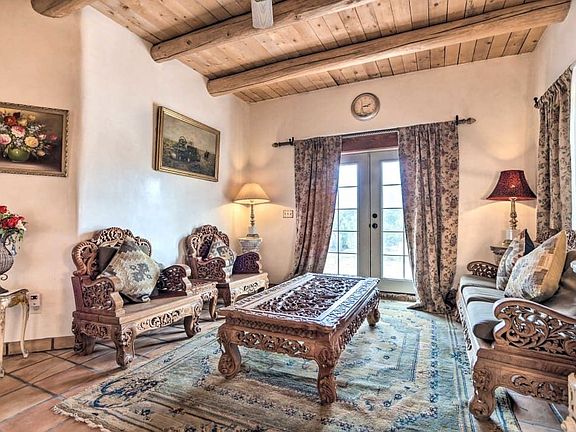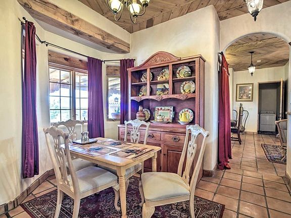 This stunning adobe home has been meticulously designed with custom finishes that add a touch of elegance and sophistication to its traditional pueblo-style hacienda experience. With 3034 sq feet of living space, this home boasts 6 comfortable bedrooms, 3.5 bathrooms, and 2 cozy kiva fireplaces. Enjoy breathtaking mountain views while basking in the beautiful New Mexico sun. The home sits on 2.4125 acres of serene land which features a 2-car garage and a beautiful Gazebo. Perfectly situated near hiking trails, golf courses, and parks, this home is only a 10-minute drive from the historic Santa Fe Plaza. Conveniently located off of Veterans Highway 599, this is the perfect oasis for those seeking peace and tranquility amidst the hustle and bustle of everyday life. All the furniture and decor is negotiable. Seller is open for seller financing with a large down payment.