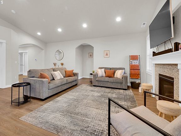 Single level home offers modern finishes and a desirable open floor plan designed for comfort and style. Modern engineered wood flooring flows throughout, complemented by tile plank floors in the bathrooms and utility room. Cozy gas fireplace in living area. Primary bedroom boasts an oversize, gorgeous tile shower, soak tub, dual sinks, and large walk-in closet. Kitchen features quartz countertops, stainless steel appliances, built-in microwave, a spacious walk-in pantry, and a beverage cabinet with a wine fridge. Step outside to a covered patio with lighting and an outdoor TV, perfect for entertaining. Fully fenced yard includes sprinklers, lush grass and plenty of room for furry friends to play. Located just a half-block from Filbert Meadows Park.