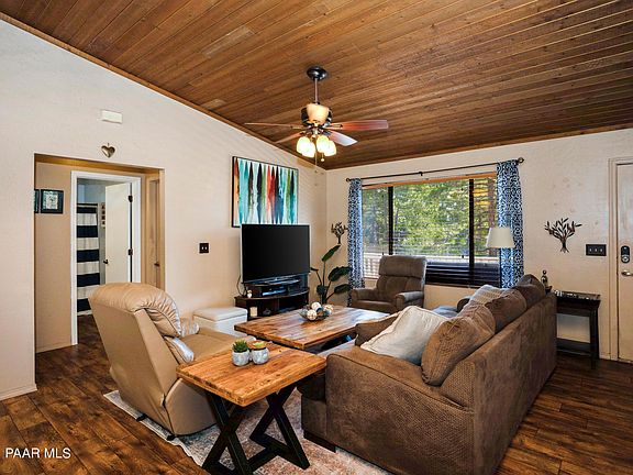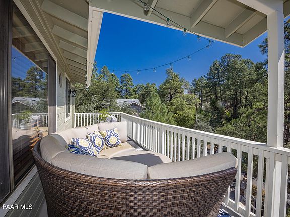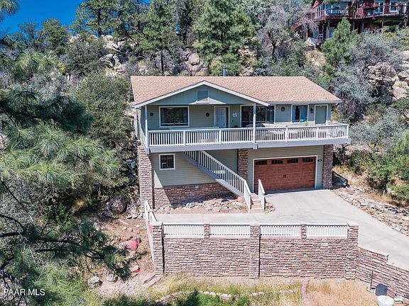 Located in the highly desirable Mountain Club neighborhood, this mountain oasis is just minutes from downtown Prescott & Historic Whiskey Row! This treetop home features a serene, private setting with stunning boulder outcroppings, towering Ponderosa Pines and mature vegetation all situated on an oversized lot! The home boasts great curb appeal with updated exterior modern colors and custom stonework. The large grassy front yard offers stunning views and there's plenty of room to relax on the front deck. Upon entry, you are greeted with gorgeous vaulted tongue & groove ceilings, stone feature wall, and beautiful wood laminate plank flooring. The great room is spacious and inviting with great views out the front and back. CONTINUE The open kitchen is equipped with abundant cabinetry, stainless steel appliances, a convenient pass-thru, and a breakfast bar. Adjacent to the kitchen is a large pantry and laundry for ultimate convenience. The nice split bedroom floorplan features a master suite with two closets and a master bath with dual vanity. The light/bright guest bedrooms each have nice views and are separated by a bathroom. One of the bedrooms is currently configured as a den. Downstairs you will find the third bedroom that has great potential for a separate work area/gym/guest suite. The two-car garage provides tons of under-house storage. The backyard is fully fenced (perfect for pets!), has gorgeous views, a built-in BBQ, and a patio that completes the picturesque private setting. This quintessential Prescott home won't last long. Come see it today!