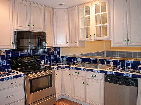 Easy condo living in a popular west side location! This wonderful home has been treated to major upgrades with beautiful terra cotta flooring and decorative tile throughout the unit. The bright, open living room features a tray ceiling with recessed lighting and an arched window. This space is separated from the large formal dining area by a charming gate flanked by two columns. Sliding glass doors in the dining room open onto a nice patio. The kitchen has attractive, light colored cabinets with a section with glass doors perfect for displaying your best china. The kitchen, which is separated from the breakfast area by a bar, is equipped with a Frigidaire electric glass top range & dishwasher, a Samsung refrigerator, a GE microwave and a double stainless steel sink. A pocket door leads to the laundry area, where the washer and dryer are included with the home. The black and white tiled master bedroom boasts an arched double window and cathedral ceiling. The attached master bath contains a tub / shower combo & a walk in closet. On the other side of the home next to the hall bath, the second bedroom features an attractive decorative ledge around the room that will provide ample space to display cherished photographs and home decor.