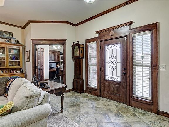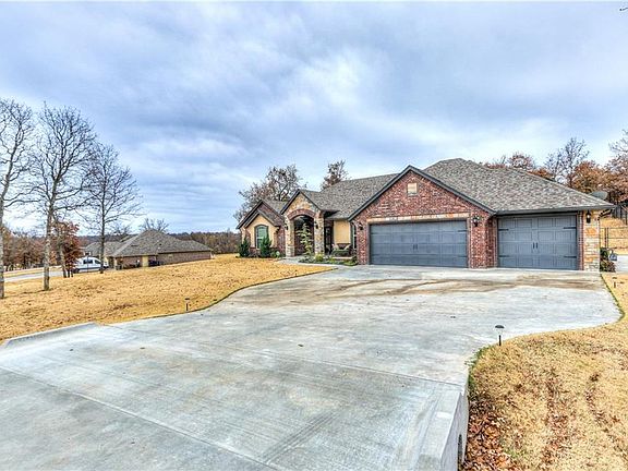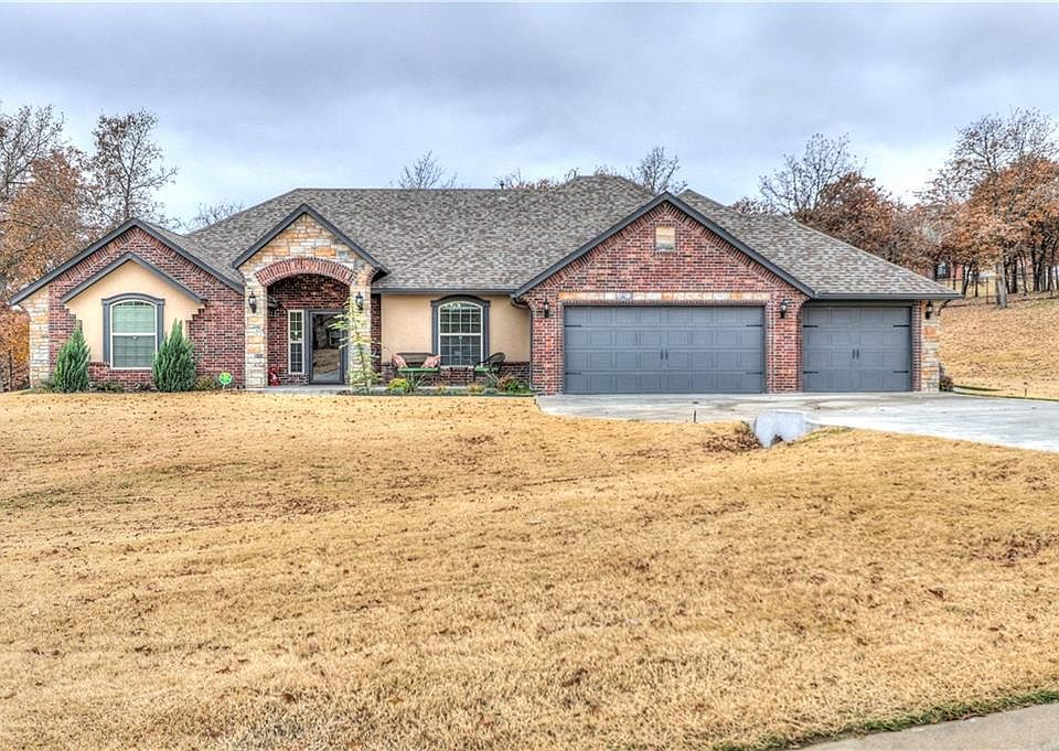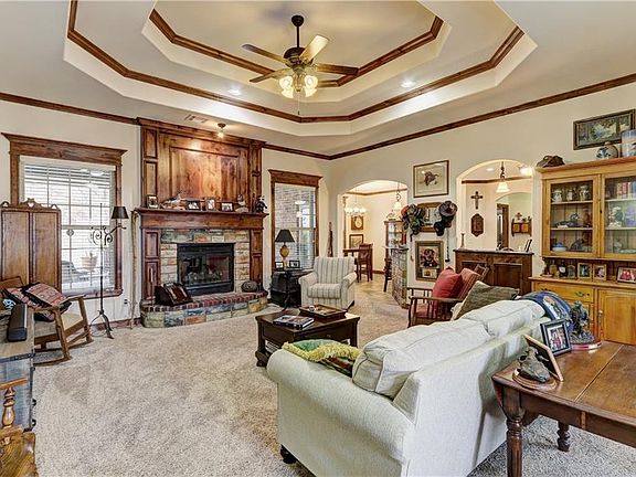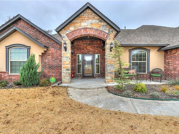 Beautiful wooded acreage lot in the highly acclaimed Bella Ranch Addition! The Living room has a wood burning fireplace with mantel & double tray ceilings! Kitchen has stainless steel appliances, custom cabinetry, wraparound breakfast bar & walk-in pantry. Secluded Master Suite ensures privacy with an En Suite Spa with double vanities, jetted tub, walk-in shower & walk-in closet with seasonal racks! Secondary rooms are spacious, 2 of the rooms include walk-in closets! Study has two built-in desks with extensive wood work! Granite counters & Rich crown molding throughout. Convenient 1/2 bath for your guests! Great views from the comfort of your own covered patio that offers an outdoor fireplace. 12 person storm shelter located in the garage! Whole yard sprinkler system will keep your yard nice & lush. Close to I-40, I-240 and Tinker Air Force Base.