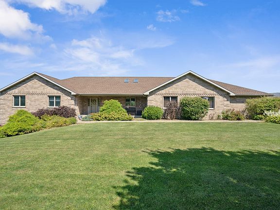 Amazing countryside views from this quality built w/o ranch home on 1.57 acre lot. If it is garages you want, this is the home for you. It has a 3 car garage with 2 car being a tandem so upper garage could potentially fit 5 cars plus a 1+ car capped below with no driveway. Nice open floorplan with vaulted ceiling, spacious kit with breakfast bar and granite tops, huge laundry/mudroom area, 4 seasons room, deck, & very spacious finished basement with huge fam rm, bedroom, office or 5th bedroom (no closet), office/playroom, & bathroom. New roof in 2020.