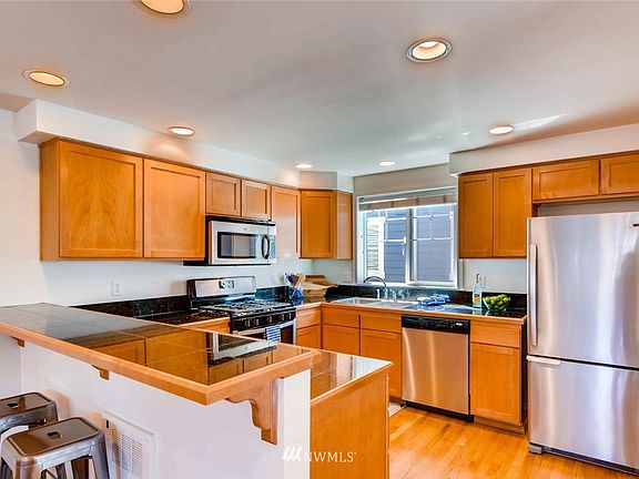 Welcome home to this vibrant Greenlake corner-unit townhome. Ideal location close to GreenLake, 99/ I-5, mins to Downtown, restaurants & shopping. Kitchen has gas range, granite tile, S/S appliances. Open living layout with nice hardwoods, cozy fireplace, and balcony. Fenced front patio perfect for entertaining. 2 spacious bedrooms upstairs w/vaulted ceilings, skylights. 1 bedroom on lower level w/ shower. 1-car garage. No HOA dues & no rental cap. Fresh paint, Move-in-ready!