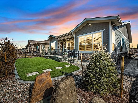 Must see this beautiful new home located at the Hilltop Inspiration resort-style active adult community, built in 2019, 1 bedroom plus den/study, primary bedroom & suite bathroom, full bathroom, 10’ ceilings throughout the home. Jefferson collection-Wakefield exterior Traditional House floor plan with larger covered front porch. Kitchen with breakfast /dining area: Generous Kitchen with center island extended w/seating area, Granite countertops with backsplash, stainless steel under mount sink & Kohler bronze faucet w/pull-out sprayer, Custom shelving with pull-outs, undermount cabinet lights, Pantry, Flooring: Engineer hardwood flooring in the kitchen, foyer, den/study & entry hall, cream color Mastercraft Concord maple 42” upper cabinets with bronze hardware Stainless-Steel appliances: 5-burner gas cooktop Kitchen Aid, vented roof, microwave oven, dishwasher, refrigerator (excluded), Oven, Great Room: Sealed gas Fireplace with stone facing title & stained Wood Mantle–Stain Color Smoke. Note fireplace has battery backup when electricity goes out, Ceiling fan & remote and recessed lights in great room & kitchen, Open floor plan w/lots of natural light. Primary Bathroom: Elongated and comfort height toilet (bidet excluded), long ceramic Tile floors, adult granite counter-tops 36”, dual oval sinks, Kohler bronze faucets, Walk-in framed clear glass shower w/chrome trim with ceiling tile to ceiling & tile floor -6”x6” ceramic tile, grab bars. Outside Landscaping 2023–xeriscape with turf, front and back sprinkler & drip system, covered patio extended concrete paver patio with iron railing and double stairs on both sides of patio, automated awning with remote control, fence:4-foot split rail with chicken wire- allowed per the HOA. Insulated steel 2 car garage doors, drywalled and taped walls, with 2 remote garage openers, Genie 3120-H Wi-Fi garage chain drive, extended garage & Epoxy floors in garage. This house offers so much more, welcome to your new home