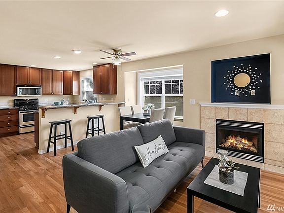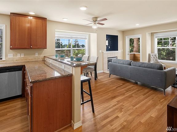 Sunny, spacious, corner-unit townhouse with a beautiful, fully-fenced private backyard. Large, open-floor main level with gorgeously refinished hardwood floors. Elegent chef's kitchen w/ gas range, beautiful granite counters & eating bar that opens to the spacious dining & living rooms, w/ cozy gas fireplace & direct access to the private deck - entertainer's dream! Fresh paint & new carpet. 1-car Garage. Easy access to DT, SLU, Interbay, transit, Greenlake & more. The good life starts here!