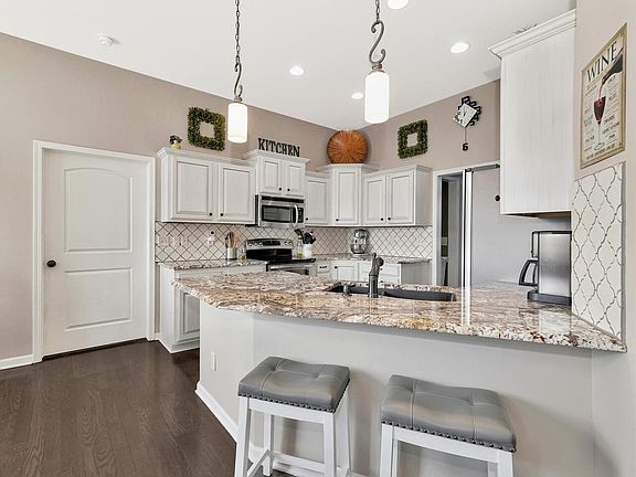 Lovely home situated on a corner cul-de-sac lot. This home in located in the popular Maize South Schools and offers 5BR & 3BA with mid-level WO/VO LL. Hardwood floors & 10' ceilings in the living room, hearth and kitchen. Well-appointed kitchen is open to the hearth & dining area and offers eating bar, granite counters, stainless steel appliances, and double oven. You'll love the convenience of the pocket door to the main floor laundry with additional pantry space. At the heart of the home on the main floor features a comfortable hearth off of the kitchen, with a door that leads to a large deck, perfect for those relaxing evenings. Nice-sized master suite is complete with a bay window, walk-in closet, and a master bathroom featuring quartz double sink vanity, soaker tub, & separate shower. The split bedroom plan is perfect for privacy. VO LL is great for entertaining & features a spacious rec room that is wired for surround sound with built-in speakers, and an adjacent finished space that is plumbed for a kitchenette or wet bar. Two additional bedrooms and a full bathroom complete the basement finish. Outdoor highlights include a wood privacy fenced backyard, very nice hot tub, great storage shed with shelving & electricity, irrigation well & sprinkler system. A few added bonuses are 2nd electrical panel under the deck with room for adding more circuits and finished & insulated garage. Located close to schools and major shopping, dining, and entertainment options, make this home a perfect place to settle down.