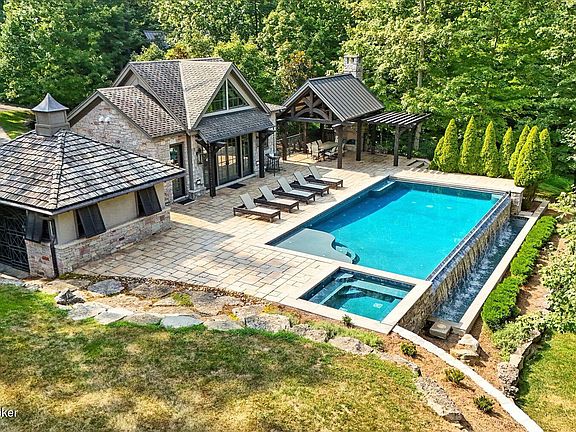 Nestled quietly within a canopy of trees, this natural timber home unfolds like a private sanctuary—part mountain retreat, part modern statement. The architecture feels rooted and intentional, blending organic materials with sleek lines and expansive glass that welcomes the outdoors in. Every space has been composed with balance and beauty in mind, creating a home that is as soulful as it is sophisticated. The entry hall sets the stage—dark wood floors, custom ironwork, and a graceful staircase that rises like sculpture. In the living room, floor-to-ceiling windows capture the forest beyond, while a coffered ceiling and stone fireplace add texture and warmth. Light spills across every surface, shifting gently throughout the day, creating an atmosphere that feels both expansive and intimately connected to nature. The kitchen is an exhibition of form and function: rich cabinetry, professional-grade appliances, and generous bar seating that encourages lingering conversation. Adjacent gathering spacesan inviting dining room and sitting areaoffer effortless flow, perfect for entertaining or quiet evenings spent among friends. A covered balcony hovers above the landscape, framing tree-top views and summer breezes. The primary suite occupies its own winga true retreat designed for rest and reflection. Vaulted ceilings and a fireplace set a tranquil tone, while a private office, dual walk-in closets, and a spa-inspired bath with marble surfaces, a copper soaking tub, and heated floors elevate every daily ritual. French doors open to the sounds of nature, blurring the line between indoors and out. Upstairs, a lofted family room and three bedroom suites continue the home's graceful design languageairy, bright, and welcoming. Below, a media and game room with a full bar invites easy entertaining, connecting to an expansive four-car garage that reflects the same attention to detail found throughout. Outdoors, the property reveals its most captivating moments. Five acres weave together manicured gardens and untamed woods, anchored by an infinity-edge pool that spills into a cascading waterfall. The pool housecomplete with kitchen and full bathroomoffers a quiet hideaway, equally suited for lively gatherings or peaceful solitude. A detached two-car garage with loft storage completes the setting, adding function to artistry. This is a home where architecture, nature, and craftsmanship exist in harmonya retreat designed not simply to be lived in, but to be felt.