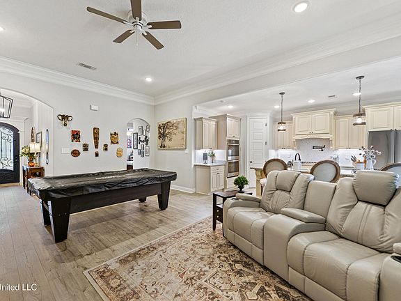 Inside, the open floor plan features a large kitchen and dining area, complete with double built-in ovens, a pull-out microwave, pot filler, walk-in pantry, and plenty of space for entertaining.