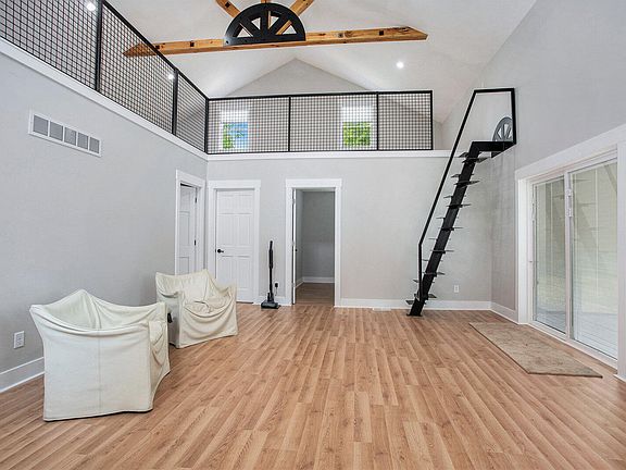 Enjoy the high ceilings, wrought iron railing, wood beams & slider overlooking a country view.